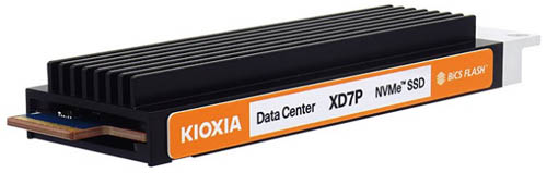 The heat sinks on this KIOXIA E1.S drive enable it to dissipate more heat than the M.2 format. (Image courtesy of KIOXIA America Inc.)