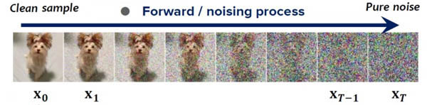 (2) The primary AI technology for image generation today. In the training phase, the neural network (image model) is fed huge numbers of image examples with their meaning (this is a cat); however, images are not stored as JPEGs or other image formats. Each image example is changed by adding a random amount of noise over many steps and then discarded. The resulting diffusion model is a network of neuron weights that were continually adjusted from all the images throughout the many training passes. See