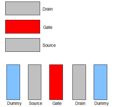 The vertical orientation (top) obviously saves space compared to the traditional horizontal arrangement of the transistor's elements.
