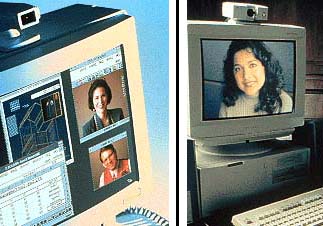 The advantage of a video window (left) is that not only can other members of a conference be viewed simultaneously, but users can work with their data at the same time. (Images courtesy of Poly Corporation and VTEL Corporation.)
